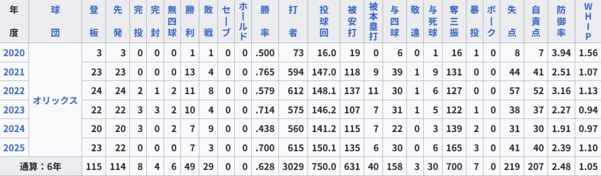 初勝利・初先発勝利:2020年11月6日対北海道日本ハム24回戦(京セラドーム大阪)、5回3失点(自責2)
